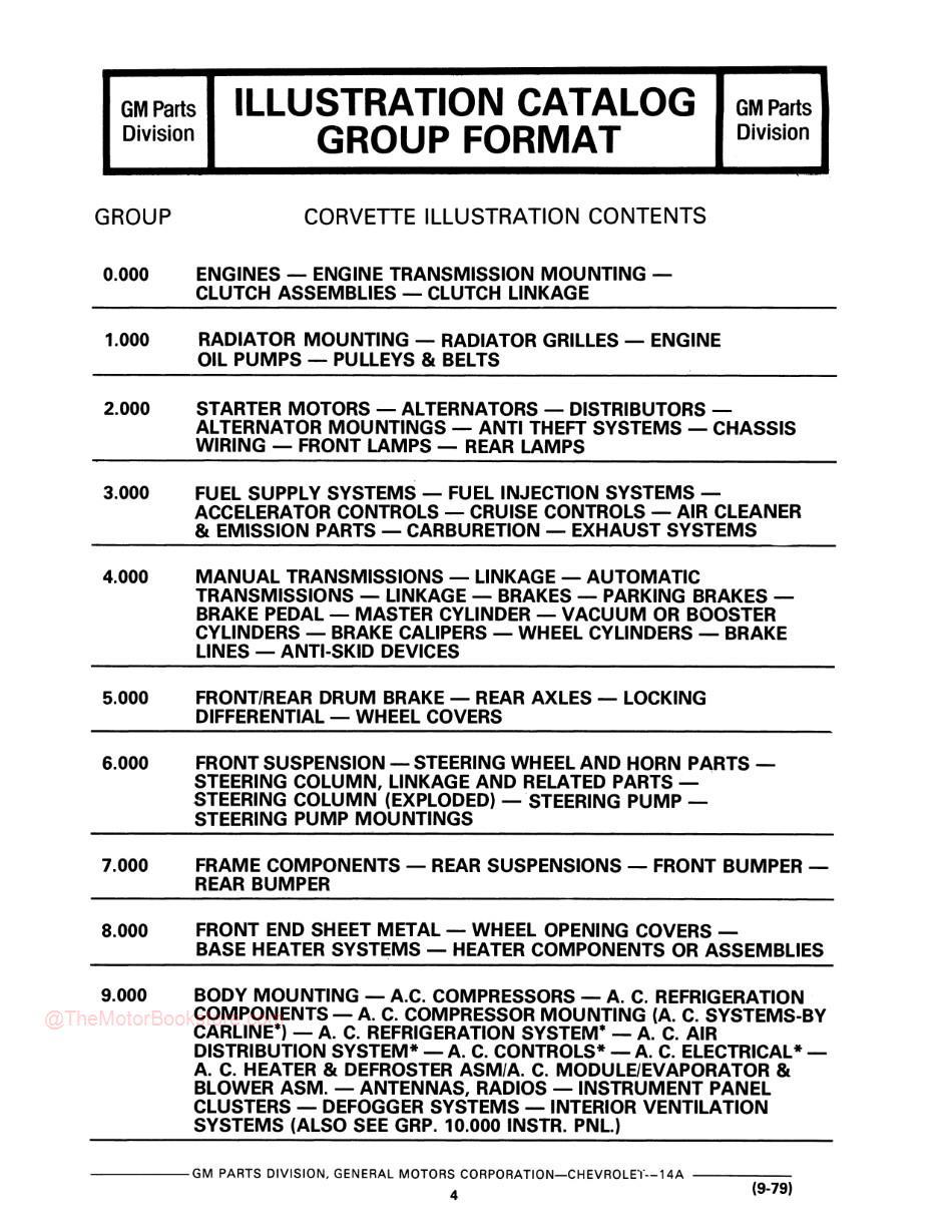 Subject: 1953, 1954, 1955, 1956, 1957, 1958, 1959, 1960, 1961, 1962, 1963, 1964, 1965, 1966, 1967, 1968, 1969, 1970, 1971, 1972, 1973, 1974, 1975, 1976, 1977, 1978, 1979, 1980 Corvette Parts Catalog (Text & Illustration) - Includes Detailed Procedures and Instructions. | OEM Part Number: 14, 14A