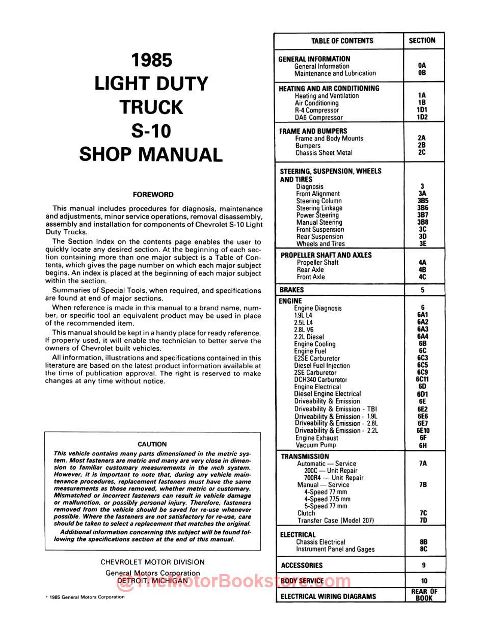 This 1985 Chevy S-10 LD Truck Shop Manual is a high-quality, licensed PRINT reproduction of the shop manual written and first published by the experts at the original equipment manufacturer (OEM), Chevrolet Motor Division, for use by their dealership mechanics. With this service manual, you'll be ready when your beloved, little Chevy is due for maintenance and repair tasks of all sizes and areas.
